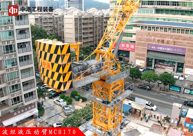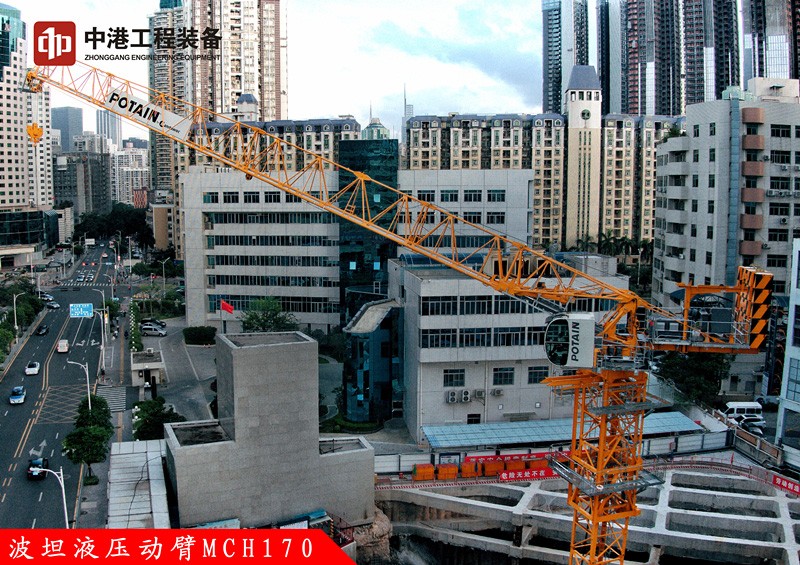 液壓動臂塔機的出現標志著深圳城市建筑施工向更安全更高效的精細化施工方向發展。波坦MCH 170 是一款全新革命性平頭式液壓變幅塔機,采用新型 VVH 液壓變幅系統,起重臂變幅由專有的新型液壓系統驅動;功耗低于傳統的變幅機構,與競品相比,需要的發電機更小,運營成本更低;變幅運動可在 2 分鐘內完成。